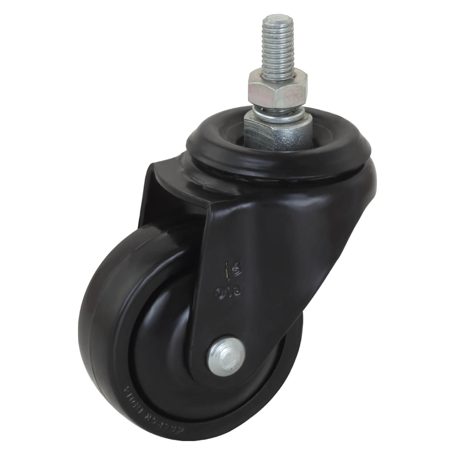 This is a swivel-type caster with a powder-coated stud steel body, equipped with a double ball raceway nylon wheel with a 65 mm diameter and a polypropylene dust-proof cover.