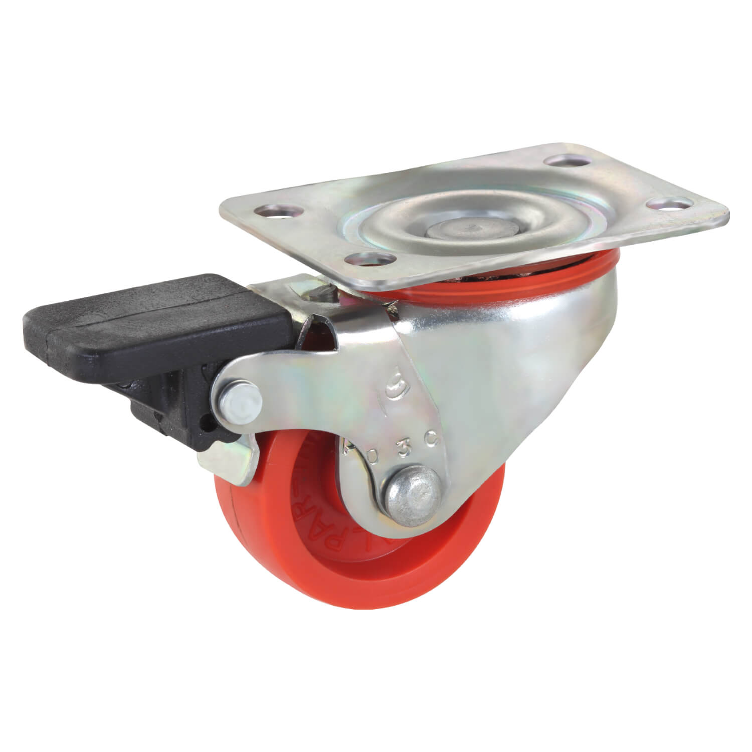 This is a swivel-type castor with a zinc-plated steel body, single ball raceway, and a 40mm diameter nylon wheel. The wheel is fitted with plain bearings for smooth operation, and the castor features a lockable system with nylon push pedal for added convenience.